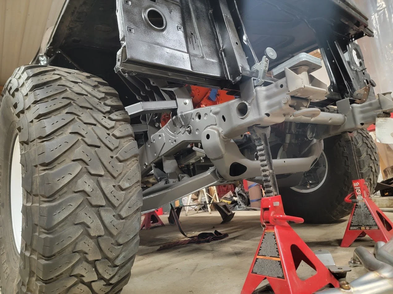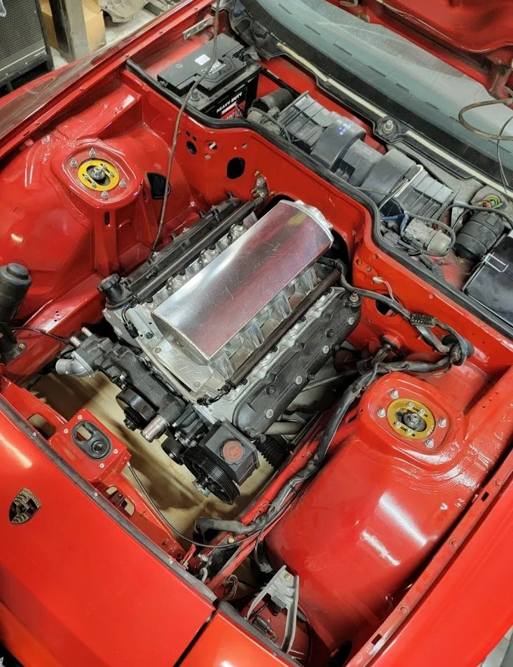 Porsche 944 with the beginnings of a custom LS swap with some special sauce in the headers and a turbo at the back of the car